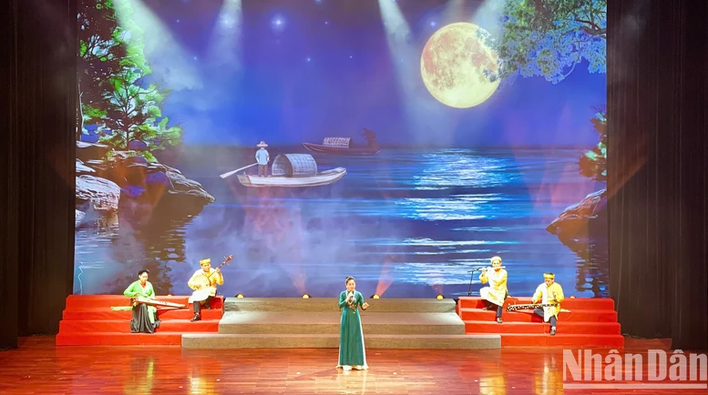 NSND Mai Thủy trình bày bài thơ "Nguyên tiêu" của Chủ tịch Hồ Chí Minh. trong chương trình khai mạc ngày thơ tại Ninh Bình - Ảnh: Báo Nhân Dân |