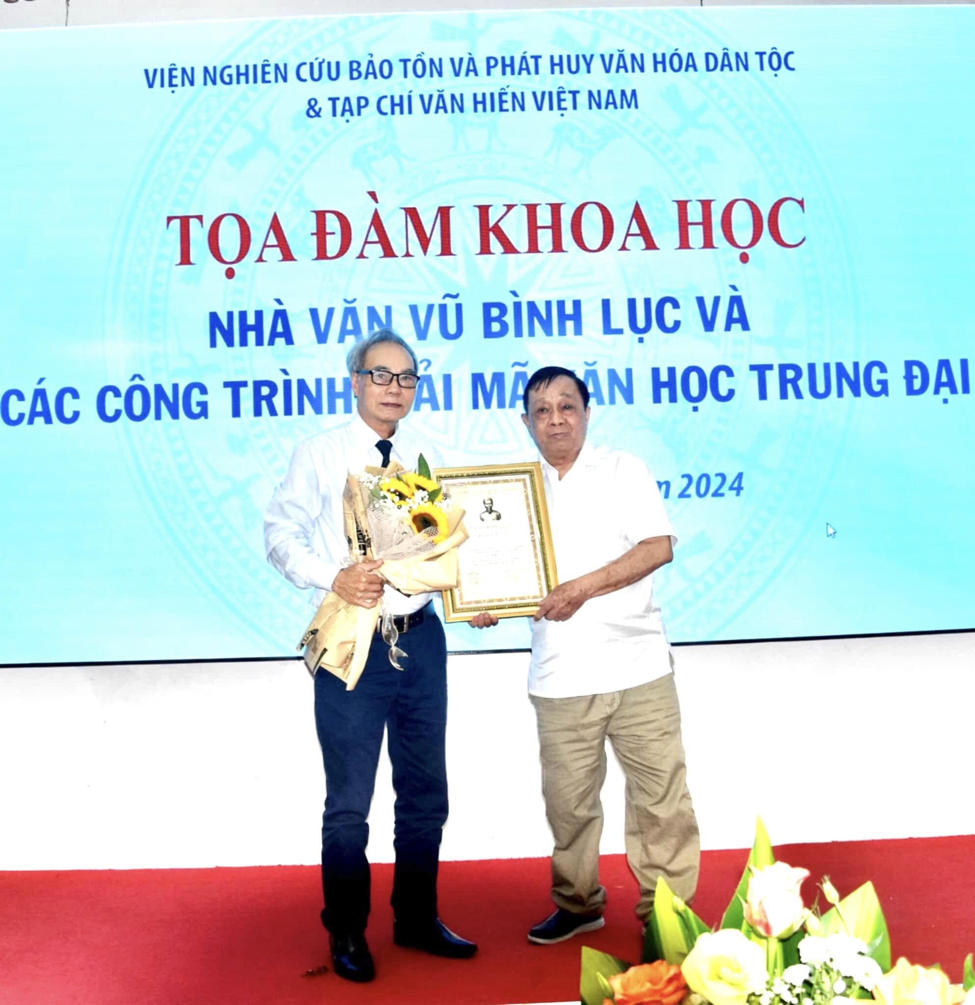 Nhà văn, nhà nghiên cứu văn học Vũ Bình Lục (trái) nhận Giải thưởng Đào Tấn.