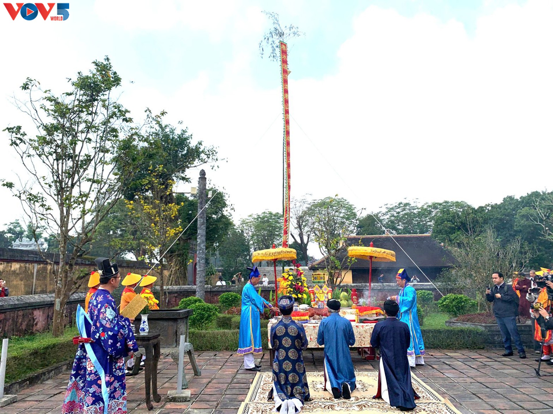 Các nghi thức dựng nêu lần lượt được cử hành, gồm lễ bái, nghinh thần, khánh hạ trong âm thanh trang nghiêm của Nhã nhạc cung đình. Tiếp đó, lính vệ tiến hành dựng nêu, báo hiệu ngày Tết đã đến trong hoàng cung. Chị Hoàng Hải Ý Nhi, chứng kiến lễ dựng nêu ở cung đình, chia sẻ: "Đây là lần đầu tiên em đến đây, chứng kiến lễ dựng nêu em cảm nhận được phong tục của cung đình Huế. Gần Tết, dân rất đông vui, nhộn nhịp. Em cảm nhận được không khí Tết rất truyền thống và rất xưa".