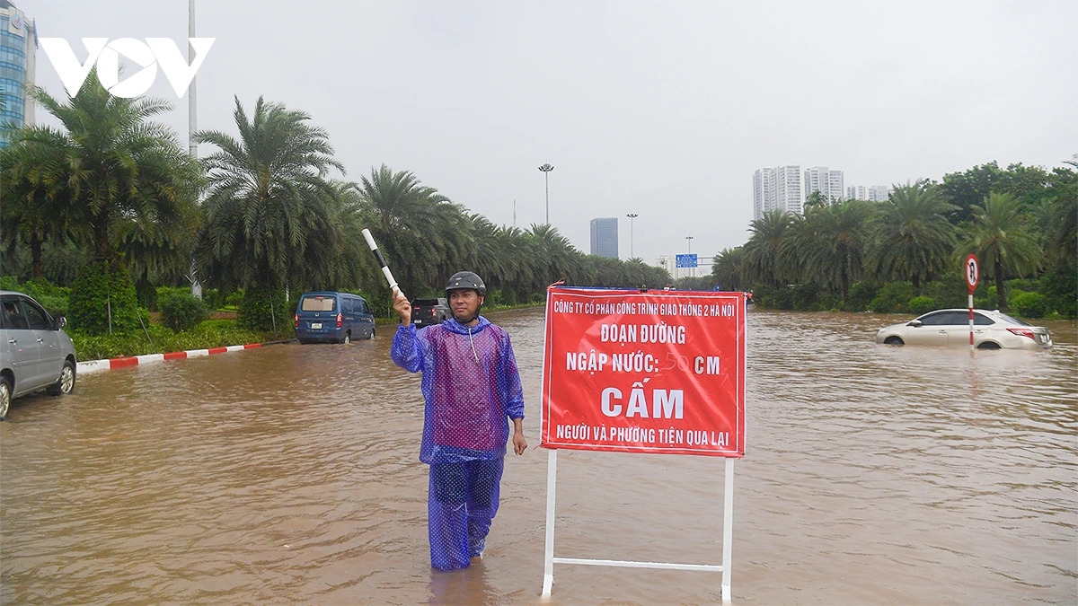 Lực lượng chức năng có mặt kịp thời cảnh báo những điểm ngập úng trên địa bàn thành phố Hà Nội. Ảnh: VOV |
