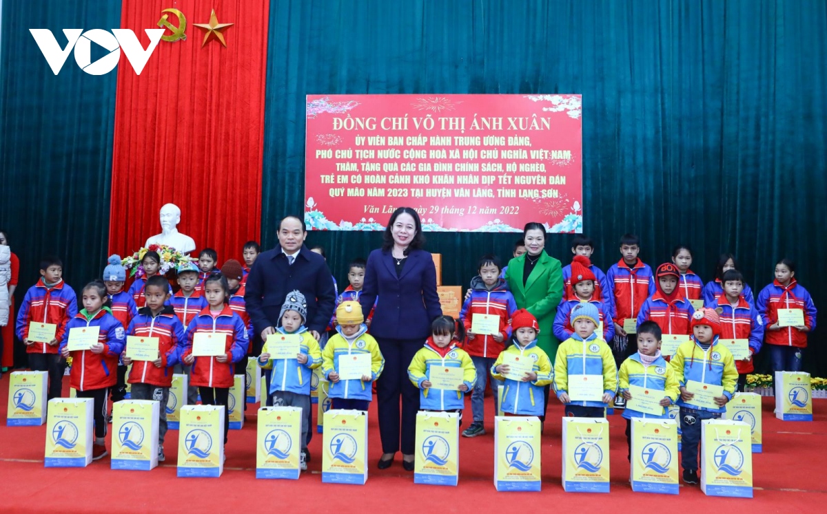 Ngày 29/12, Phó Chủ tịch nước Võ Thị Ánh Xuân đến thăm, tặng quà gồm 200 triệu đồng cho trẻ em hoàn cảnh khó khăn, 500 triệu đồng hỗ trợ xây dựng 10 nhà “Đại đoàn kết” cho các hộ nghèo tại huyện Văn Lãng, tỉnh Lạng Sơn. Chị Hoàng Thị Eng và anh Hoàng Văn Hưng, người dân xã Thanh Long, huyện Văn Lãng, 2 trong số hộ nghèo được hỗ trợ, chia sẻ: "Rất vui vì được Nhà nước quan tâm đến những hộ nghèo như gia đình chúng tôi. Tết đến rồi nhận được những món quà này tôi thấy rất vui và phấn khởi. Tết này chúng tôi đã có 1 cái Tết đầy đủ và no ấm hơn.