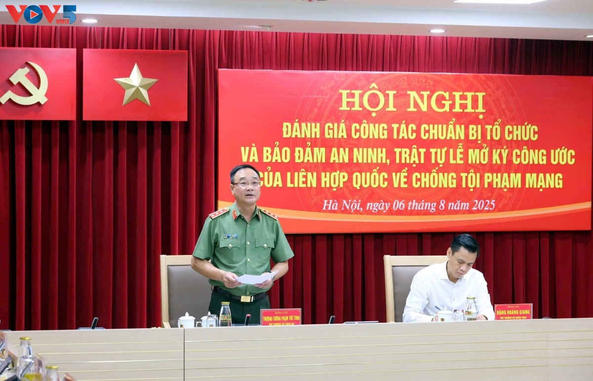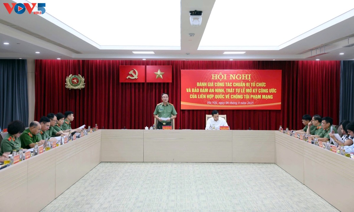 Hội nghị đánh giá công tác chuẩn bị tổ chức và bảo đảm an ninh, trật tự Lễ mở ký Công ước của Liên hợp quốc về chống tội phạm mạng. Ảnh: Huy Nam/VOV |