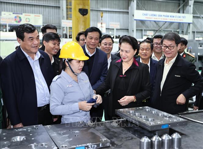 Chủ tịch Quốc hội Nguyễn Thị Kim Ngân thăm các phân xưởng sản xuất và lắp ráp xe của Thaco Chu Lai. Ảnh: Trọng Đức - TTXVN |