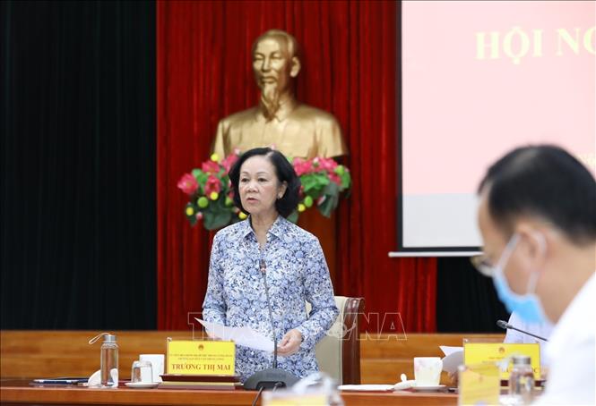 Bà Trương Thị Mai, Trưởng Ban Dân vậnTrung ương, Chủ tịch Hội đồng Công tác quần chúng Trung ương phát biểu kết luận hội nghị. - Ảnh: Văn Điệp/TTXVN |