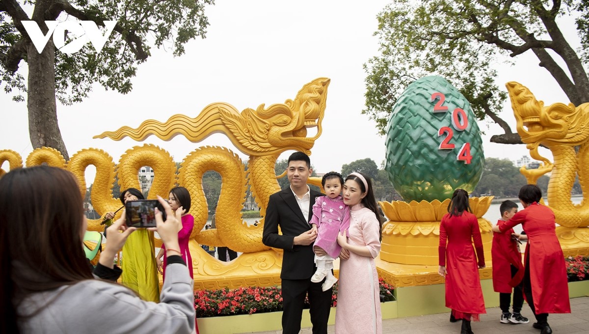 Các gia đình tập trung chụp ảnh lưu giữ lại kỉ niệm với biểu tượng năm Giáp Thìn 2024 tại khu vực Hồ Gươm. Ảnh: VOV |