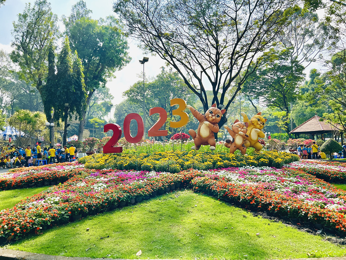 Khu vực bồn biểu tượng với hình ảnh những chú mèo đang biểu diễn điệu nhảy như thể hiện sự thành công, vui vẻ của năm 2023 và hướng đến thành công của những năm kế tiếp. Ảnh: thanhnien.vn |