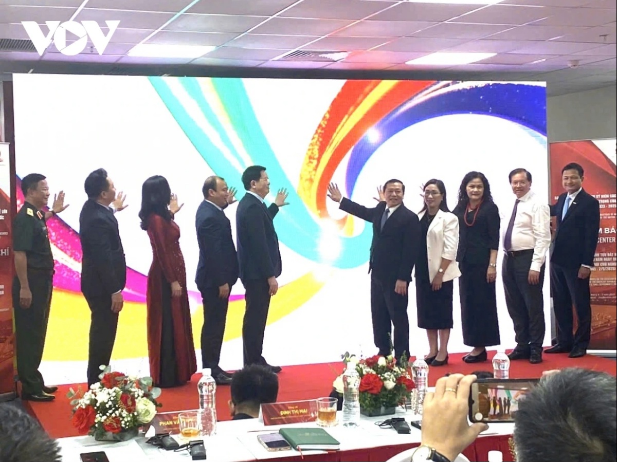Các đại biểu thực hiện nghi thức khai trương. Ảnh: VOV |