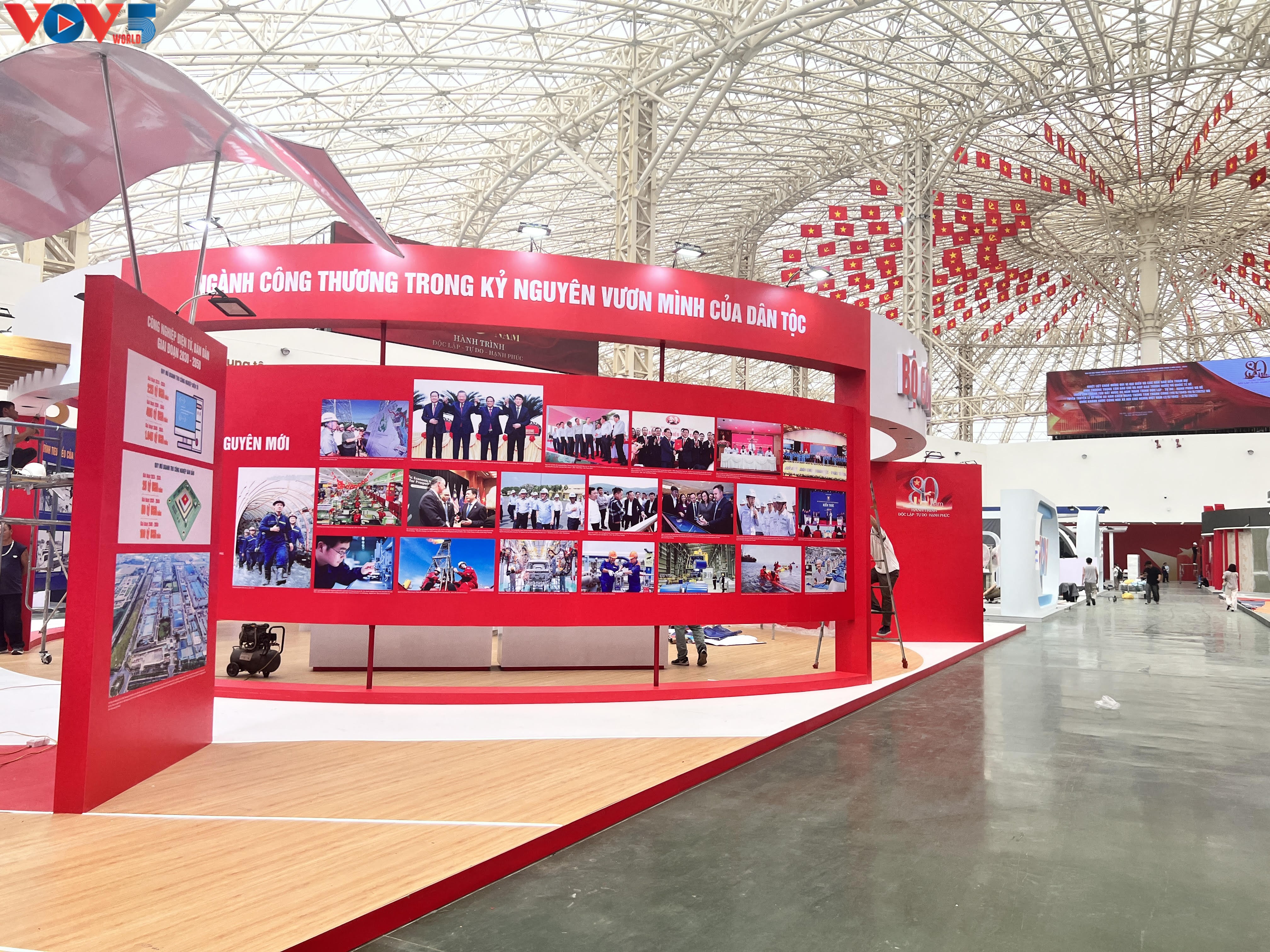 Thời điểm hiện tại, hoạt động chuẩn bị tại các gian trưng bày tại Trung tâm Hội chợ Triển lãm Quốc gia diễn ra vô cùng khẩn trương. Các đơn vị thi công đang "vượt nắng thắng mưa" để hoàn thiện từng hạng mục, chuẩn bị cho ngày khai mạc 28/8 tới.