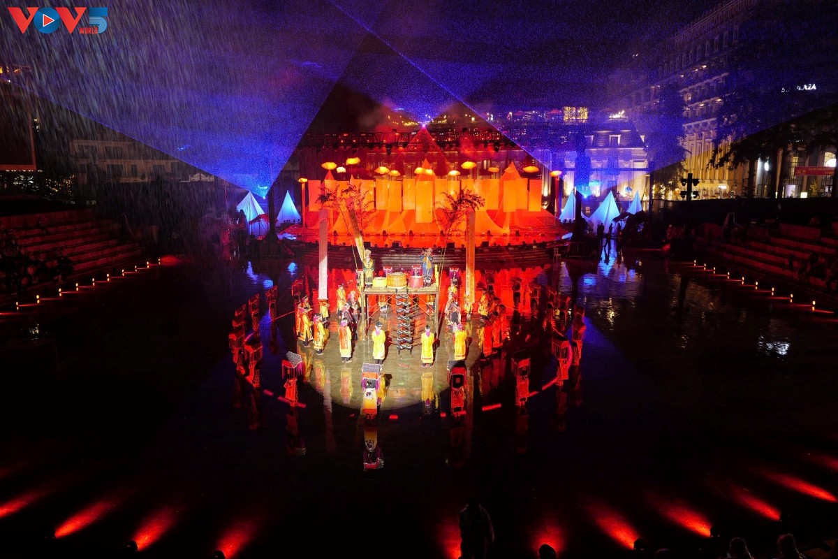 Ánh sáng chuyển sắc như nhịp điệu của thiên nhiên: màu nâu đất ấm trong cảnh “Tìm đất, lập bản”, màu lam phảng phất trong “Cầu mưa”, sắc lửa rực hồng trong “Bếp thiêng”, và thứ ánh sáng trắng thanh khiết khi 12 ngọn đèn cấp sắc bừng lên giữa màn sương Sa Pa. Những bức tranh thờ, những mảng đỏ biểu tượng, những đường nét bản địa được tôn lên bằng ánh sáng… tất cả như hơi thở của núi rừng hóa thành nghệ thuật.