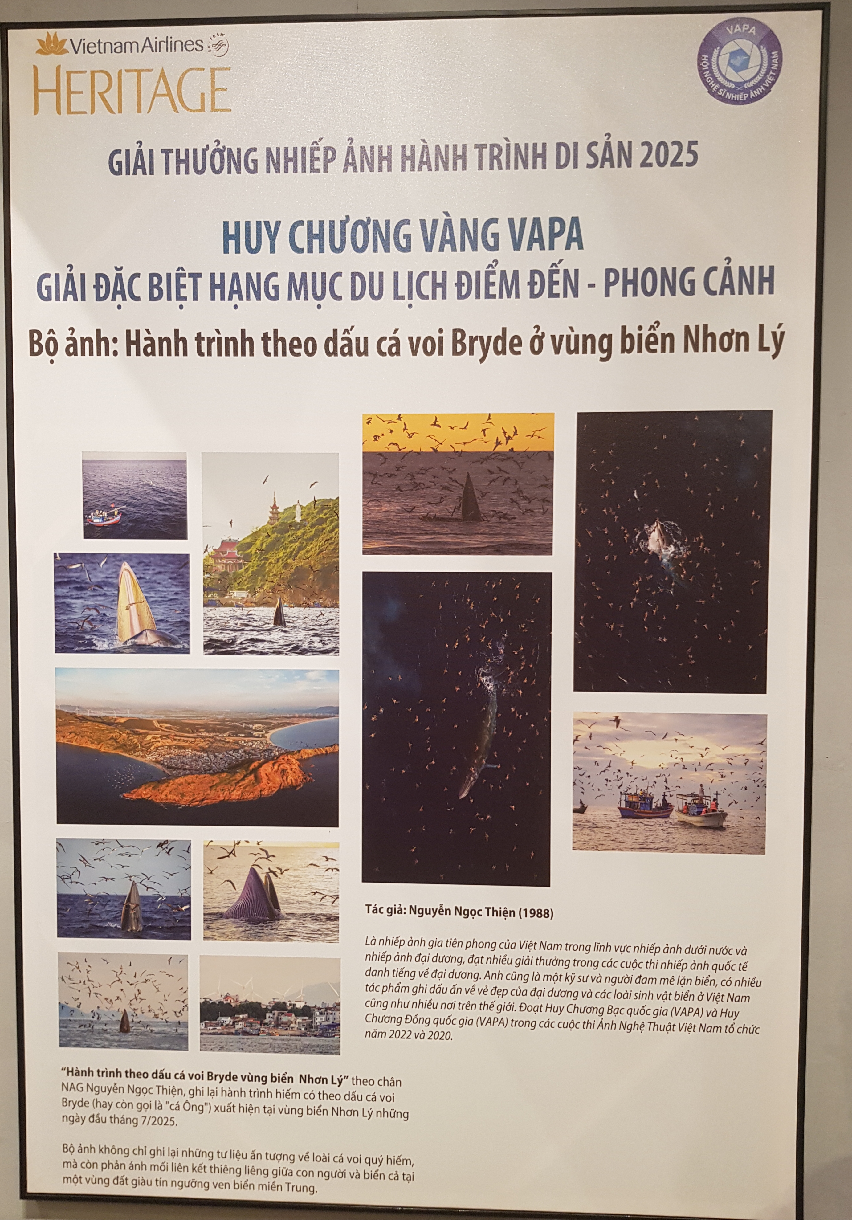 Nghệ sĩ nhiếp ảnh Nguyễn Ngọc Thiện (Thành phố Hồ Chí Minh) cho biết: "Bộ ảnh mô tả hành trình theo dấu loài cá voi đến vùng biển Nhơn Lý, Việt Nam vào tháng 7/2025. Năm nay, cá voi đến khá gần bờ nên tạo điều kiện cho những nhà báo, nhà nhiếp ảnh có cơ hội chứng kiến tận mắt. Tôi theo tàu của ngư dân để chờ đợi cá voi xuất hiện. Rất kỳ công và may mắn do là mình không thể biết cá voi xuất hiện lúc nào. Đàn cá voi với 3 cá thể, trong đó có 1 con mẹ, 1 con con còn 1 cá thể đi riêng lẻ đi lên vùng biển Nhơn Lý."