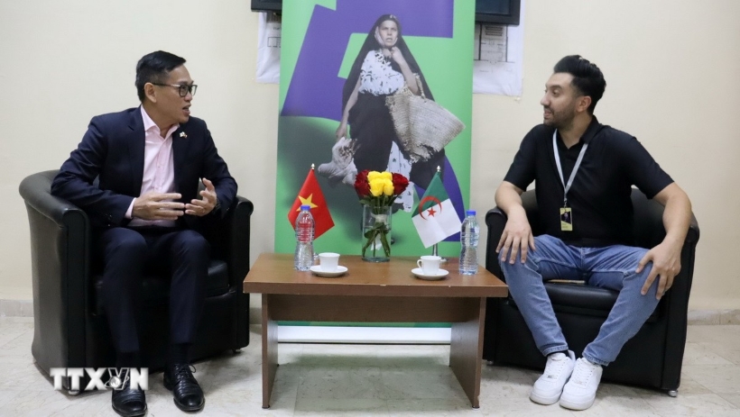 Đại sứ Việt Nam tại Algeria Trần Quốc Khánh trao đổi với ông Issam Taachit, Giám đốc Liên hoan phim Imedghassen. Ảnh: Mạnh Hùng/TTXVN |