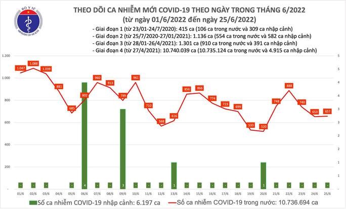(VOV5) - Bản tin phòng chống dịch COVID-19 của Bộ Y tế cho biết tính từ 16h ngày 24/6 đến 16h ngày 25/6, trên Hệ thống Quốc gia quản lý ca bệnh COVID-19 ghi nhận 657 ca mắc mới đều ở trong nước tại 36/63 tỉnh, thành phố. Trong ngày 25/6, có 5.239 bệnh nhân khỏi bệnh, tiếp tục không có ca tử vong.