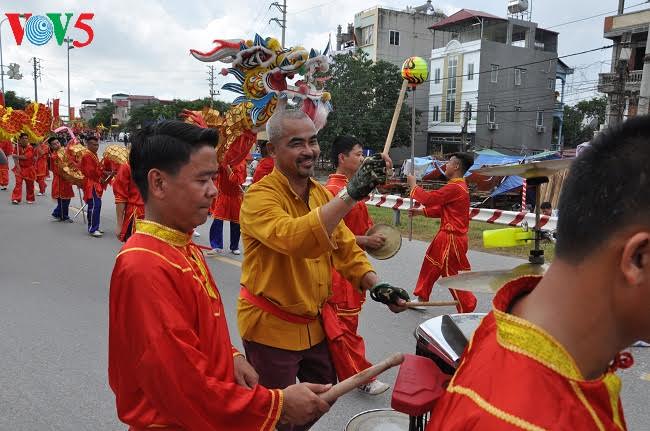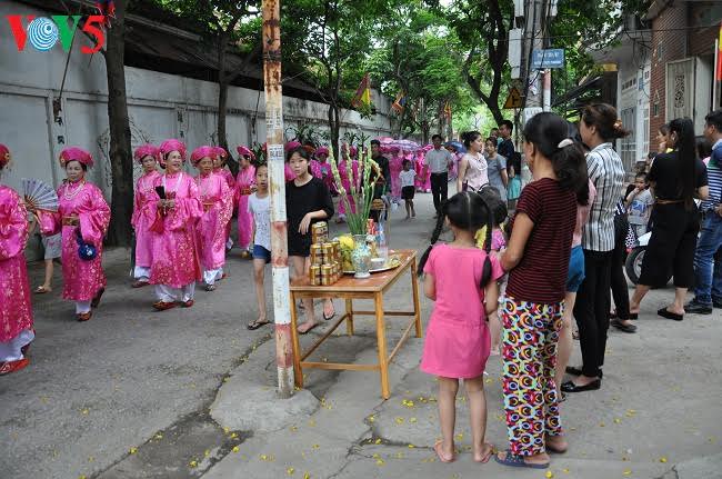 Người dân bày lễ bên đường cúng vọng Thành hoàng khi đoàn rước văn về tế lễ xuất phát từ đình đến chùa Chèm.