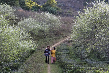 Đặc biệt, khi đến Mộc Châu vào mùa xuân, du khách thập phương sẽ được chiêm ngưỡng cảnh sắc độc đáo của mảnh đất này. Khắp các quả đồi, những khoảng sân vườn có trăm hoa khoe sắc, những rừng đào phai, rừng mận trắng muốt xen lẫn làn mây mỏng trong nắng sớm khiến Mộc Châu đẹp huyền ảo đến lạ kỳ. Xen lẫn trong sắc màu đó, là tiếng khèn môi dặt dìu của đồng bào dân tộc Mông tạo nên nét lãng mạng riêng có của cao nguyên xinh đẹp này. Chị Kiều Như, khách du lịch Hà Nội, cho biết: "Đây là lần đầu tiên tôi đến đây và cảm thấy rất là vui. Có rất nhiều cảnh đẹp, con người ở đây rất là mến khách. Sáng nay tôi đến đồi thông khi còn cả sương sớm, rất là đẹp."