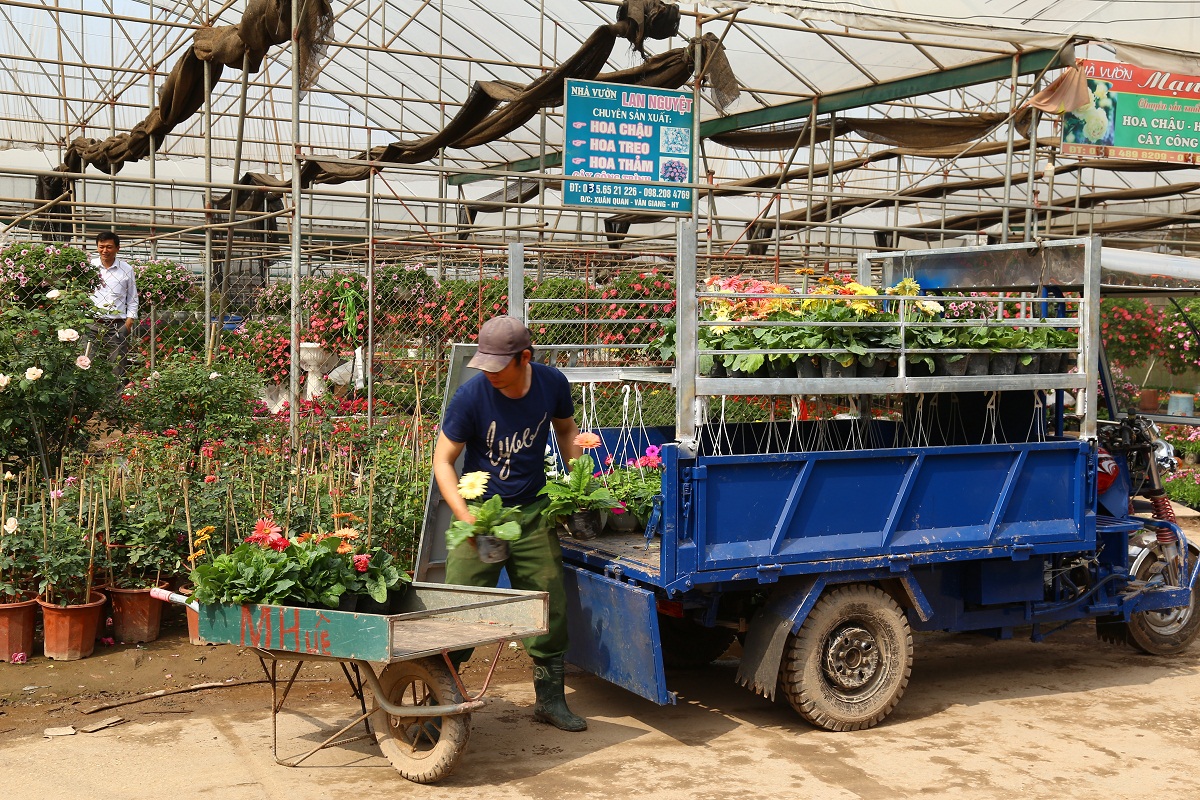 Những ngày giáp Tết, không khí tại làng hoa Xuân Quan khá nhộn nhịp. Các ngả đường dẫn vào làng lúc nào cũng tấp nập. Mỗi ngày có cả trăm chuyến xe tải các cỡ từ các tỉnh thành vào vườn, mua và vận chuyển hoa đi bán.