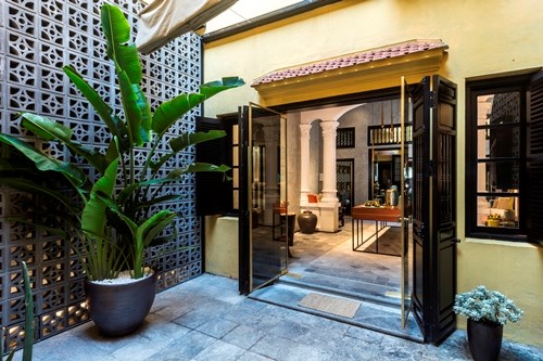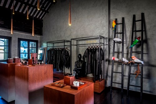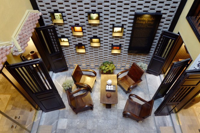 Khoảng sân sau vẫn trồng hoa cỏ,hẹp và thắt lại theo kiến trúc chung của những ngôi nhà ở phố Hàng Đào. Kết cấu mái với cột đỡ hình đầu rồng nguyên bản vẫn phủ bóng thời gian. Với cách bài trí tinh tế của Hanoia, tinh hoa sơn mài Việt hiện diện sang trọng trên những chiếc bàn sơn mài tuyệt mỹ.