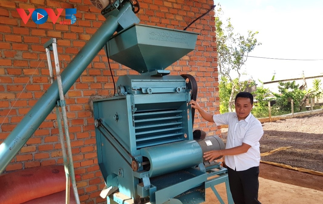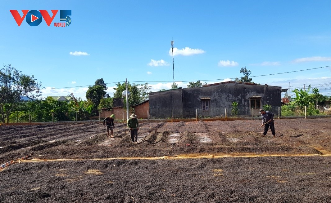 Thực hiện công đoạn phơi cà phê trong sân nhà anh Siu Pớp - Ảnh: VOV5/Ngọc Anh