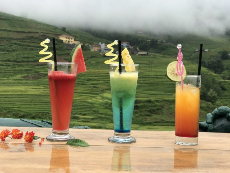 Cả một khoảnh sân rộng là không gian dành cho quán cà phê được thiết kế theo không gian mở. Ngồi bất cứ đâu, du khách cũng có thể ngắm nhìn thỏa thuê các thửa ruộng bậc thang vàng óng như mật, những áng mây trắng trôi bồng bềnh trên nền trời xanh trong.