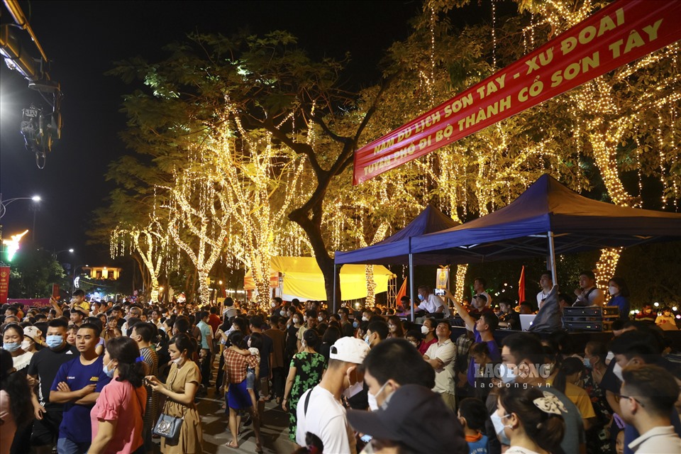 Phố đi bộ ngay gần Thành Cổ Sơn Tây những ngày đầu khai trương. Phố có tổng chiều dài khoảng 820m; tổng diện tích khoảng 34.550m. Thời gian hoạt động: Thứ Bảy và Chủ nhật hàng tuần. Ảnh báo Lao động. |