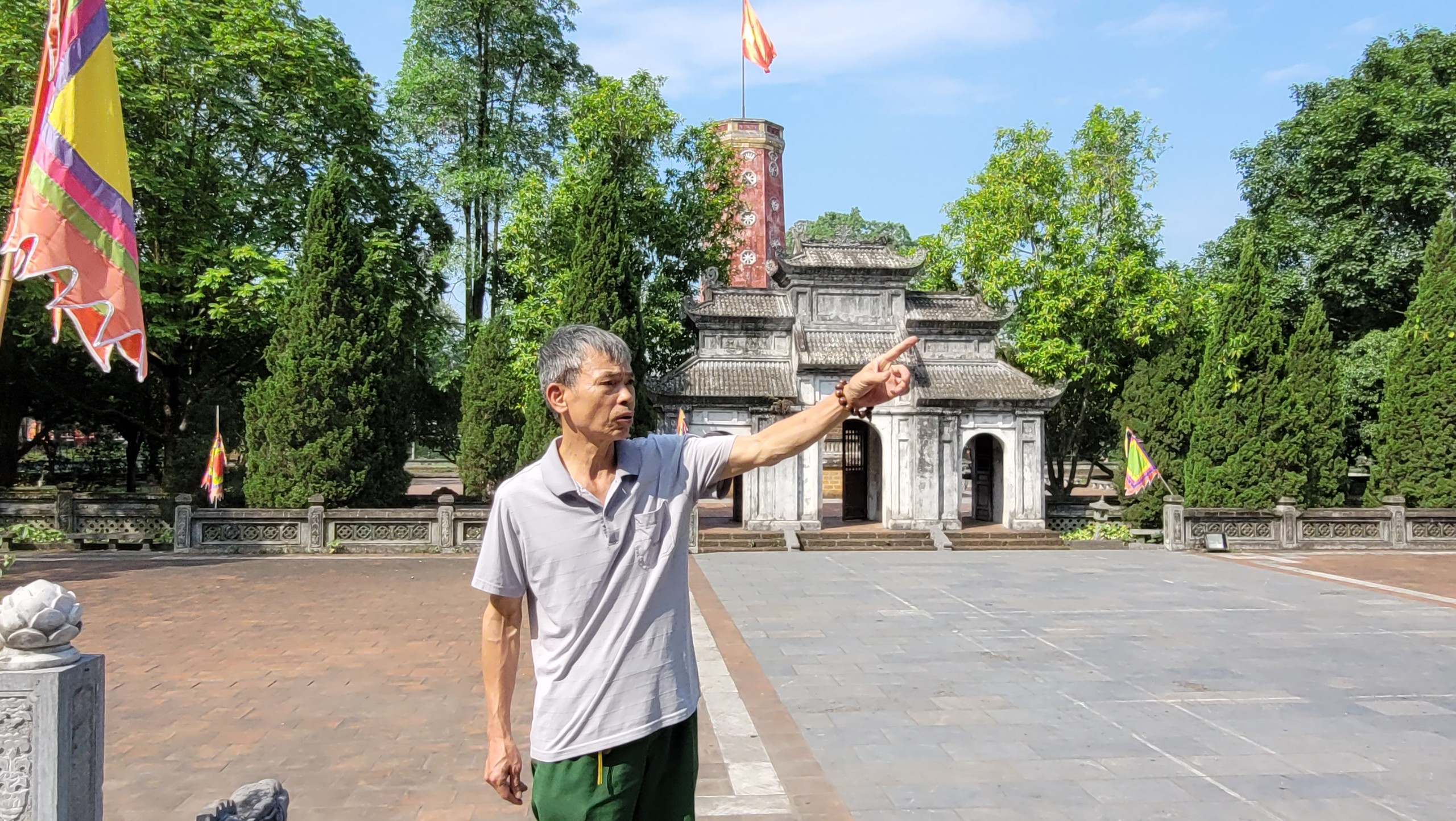 Ông Trần Văn Thành, người trông coi khu vực Điện Kính Thiên, rất am hiểu về lịch sử Thành cổ Sơn Tây. |