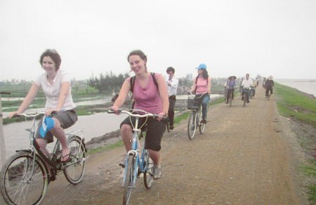 Phương tiện duy nhất để tham quan làng quê Giao Xuân là đi xe đạp. Nhẩn nha đạp xe đi trên con đường bê tông nhỏ quanh làng để được tận hưởng làn gió mát rượi từ biển thổi vào, ngắm nhìn những giọt sương vẫn còn đọng lại trên những tán cây ven đường. Buổi sáng ở Giao Xuân, khách thích đạp xe ra con đường đê ven biển, ngắm bình minh và tàu cá cập bến.