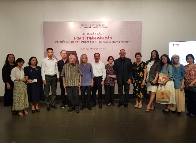 Các đại biểu chụp ảnh lưu niệm trong lễ ra mắt sách danh họa Trần Văn Cẩn. Ảnh: Ngọc Anh |
