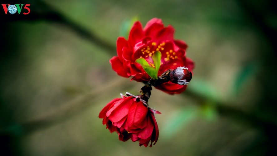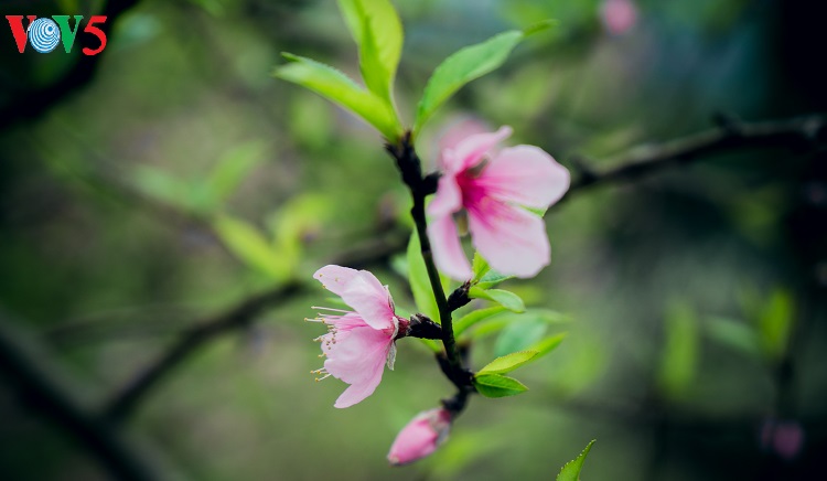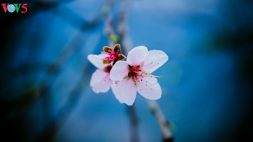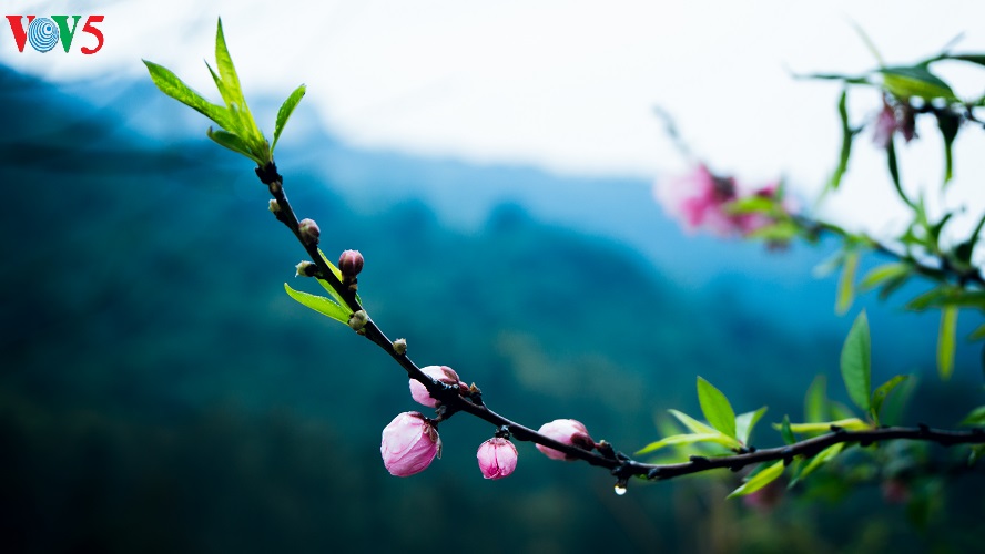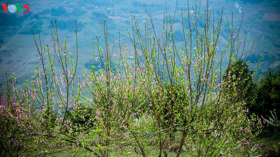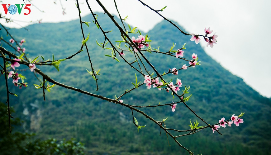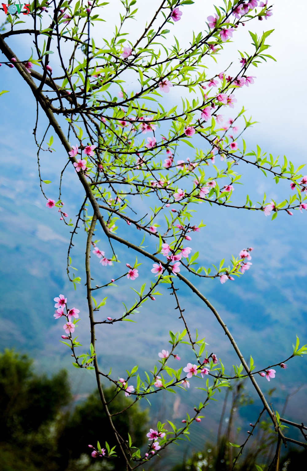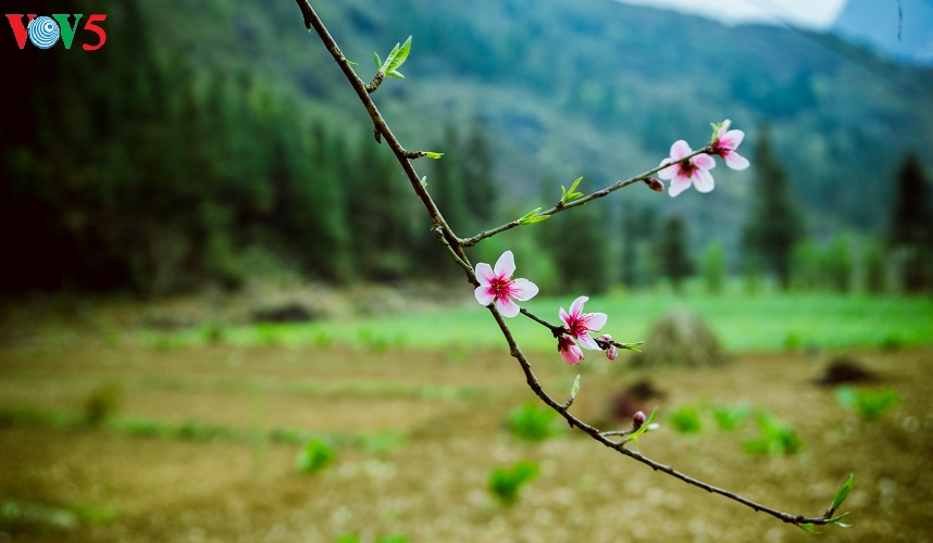 Sắc đào thắm vươn mình giữa nền xanh biếc của núi rừng biên cương. |