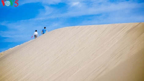 (VOV5) - Những cồn cát nối tiếp, trải dài, trắng ngà pha vàng bên bờ biển xanh rì rào sóng vỗ và cạnh những khu rừng bát ngát tạo nên một vẻ đẹp kỳ thú cho mảnh đất nắng gió Bình Thuận. Đó là vẻ đẹp hoang sơ, kỳ vĩ mà cũng rất đỗi thơ mộng, hữu tình của đồi cát Bàu Trắng thuộc xã Hòa Thắng, huyện Bắc Bình. Khá nhiều du khách ví khu vực này giống như một tiểu sa mạc bên biển xanh bởi địa hình, hệ sinh thái mang một số tính chất đặc trưng của những sa mạc cát. Sự kết hợp giữa vẻ đẹp của cát, hồ nước ngọt xanh trong, bờ biển, cây bụi, những đám sen trên hồ và cả cuộc sống đơn sơ, bình yên của người dân giữa lòng sa mạc cát tạo ra vẻ đẹp đặc sắc, gây ấn tượng như một tiểu kỳ quan của thiên nhiên.