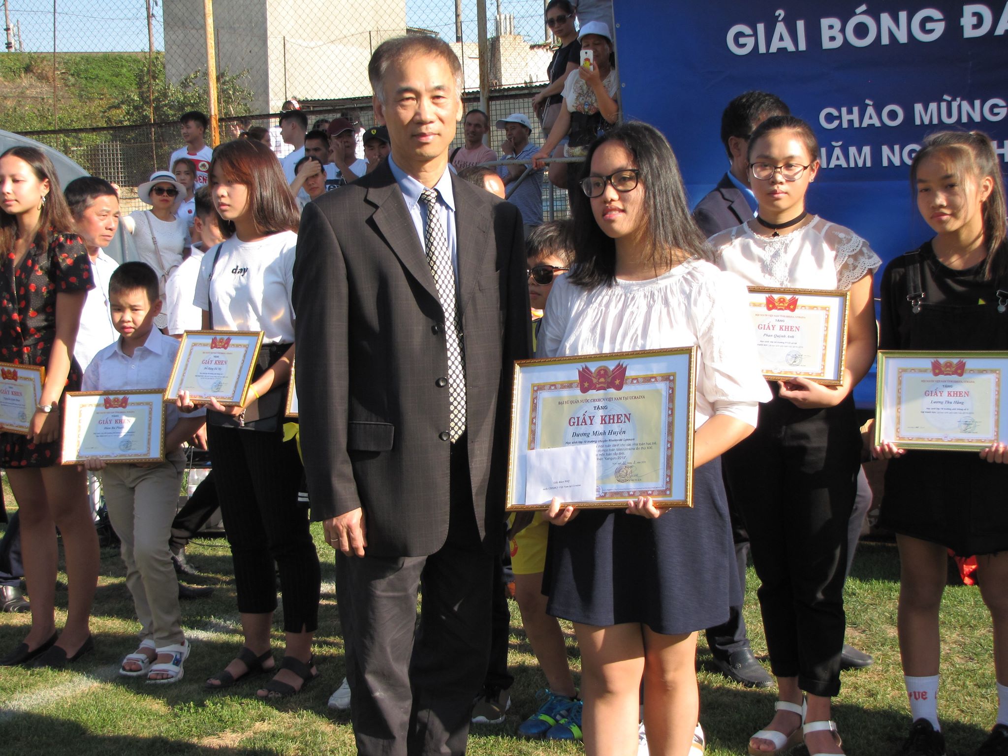 Ông Nguyễn Như Mạnh chủ tịch Hội người Việt Nam tỉnh Ô-đét-sa tuyên dương và trao bằng, giấy khen cho các em học sinh đạt thành tích xuất sắc trong năm học 2018-2019 cũng như những em đoạt những giải cao trong các cuộc thi các cấp.
