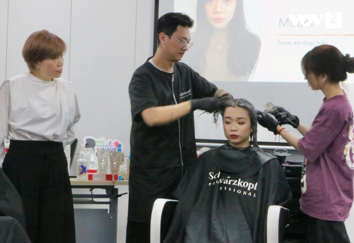 Chị Mai Lan (áo trắng) cùng chuyên gia về tóc hướng dẫn cho các học viên học nghề tại Salon Mai Lan - Ảnh: VOV |
