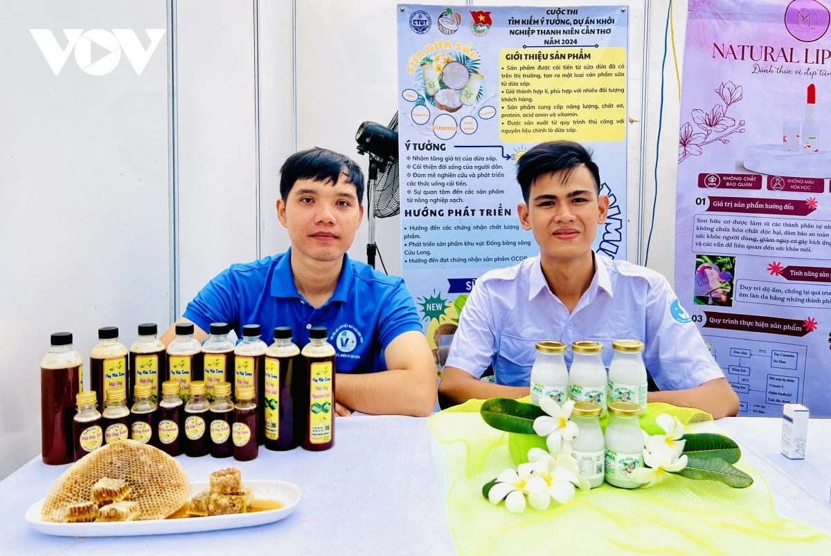 Sản phẩm khởi nghiệp “Ong nhà Trọng” và Sữa dừa sáp - Cocovimilk. Ảnh: Hồng Phương/VOV |