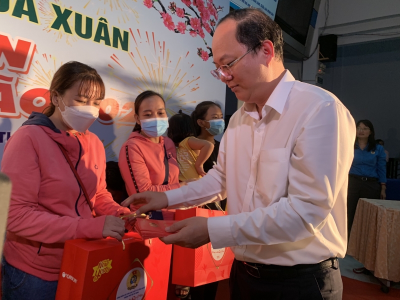 Lãnh đạo Thành phố Hồ Chí Minh tặng quà và lì xì cho các gia đình công nhân về quê trên "Chuyến tàu mùa xuân". |