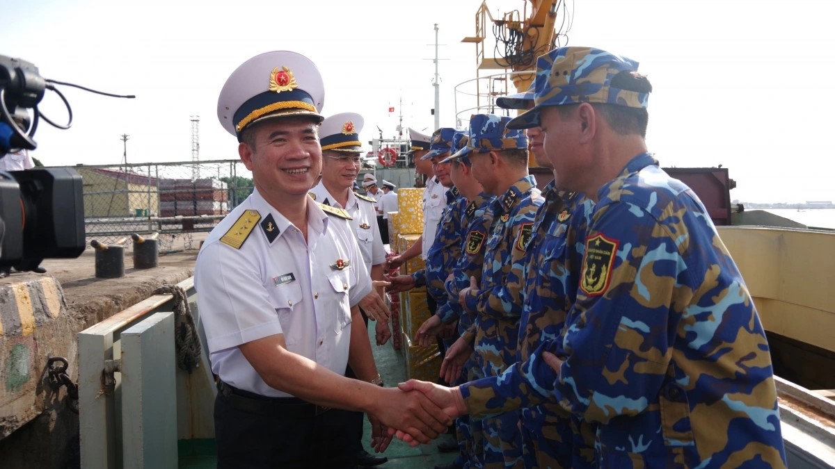 Thượng tá Bùi Ngọc Sang, Chính ủy Hải đoàn động viên cán bộ, chiến sỹ Tàu 638 trước khi xuất phát. Ảnh: VOV |