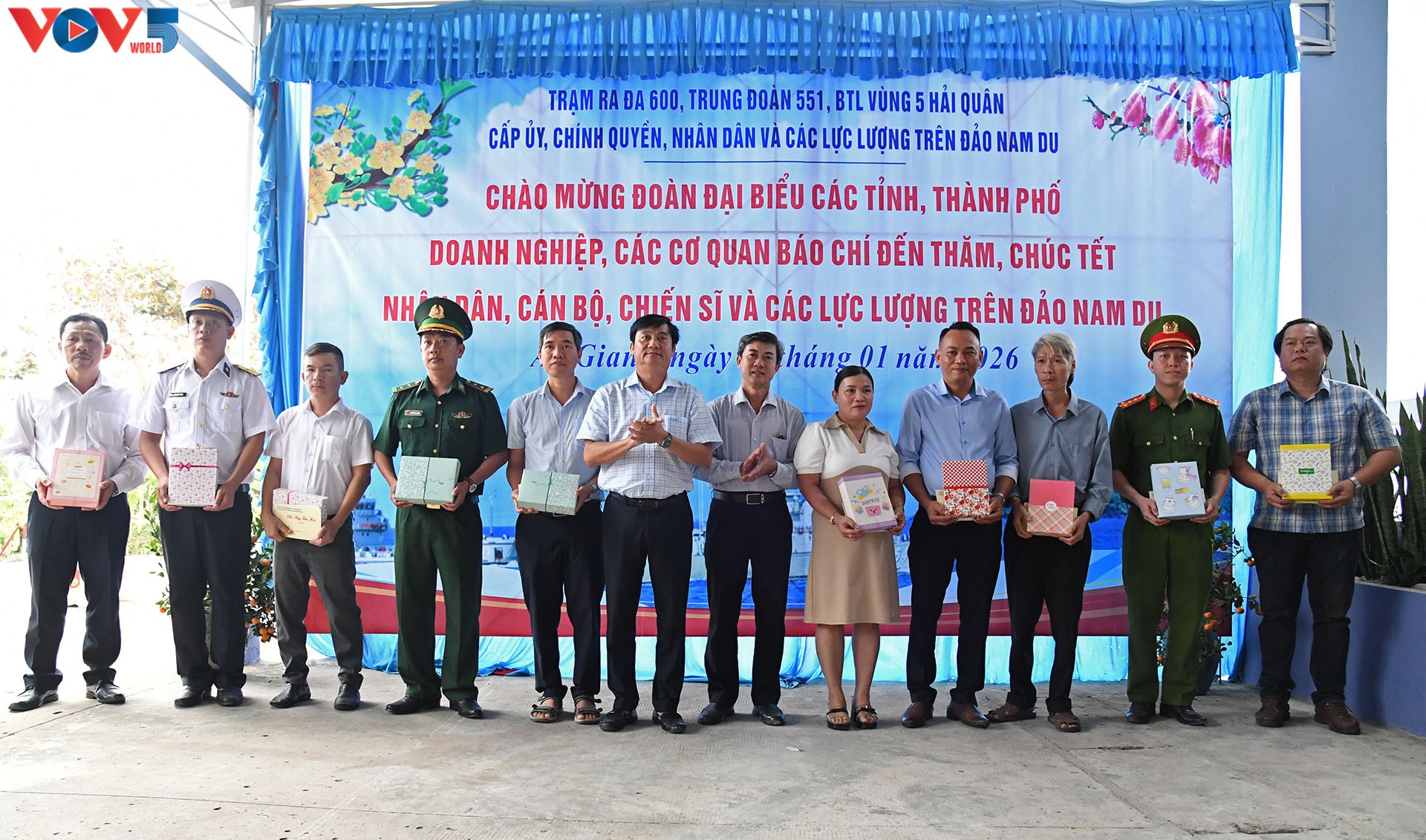 Những món quà chan chứa tình quân dân được trao cho 10 đơn vị, gồm: Đảng uỷ Uỷ ban nhân dân Tiểu khu An Sơn, Trạm ra đa 600, Đồn biên phòng 742, Trạm Hải đăng Nam Du, Trường mầm non An Sơn, Trường Tiểu học An Sơn, Trường Trung học cơ sở An Sơn, Cảng vụ Hàng hải Nam Du, Công an Tiểu khu An Sơn, Trạm Y tế An Sơn. Đây là tình cảm của lãnh đạo và các đoàn thể gửi tới chiến sĩ và người dân trên đảo Nam Du nhân Tết Nguyên đán 2026, chứa đựng nhiều ý nghĩa, là nguồn động viên, khích lệ các chiến sĩ và người dân sống trên đảo tiếp tục an tâm công tác, bám biển, bám đảo. Đây cũng là dịp để đoàn công tác có cơ hội trò chuyện, tìm hiểu về cuộc sống và chiến đấu của chiến sĩ trên đảo.