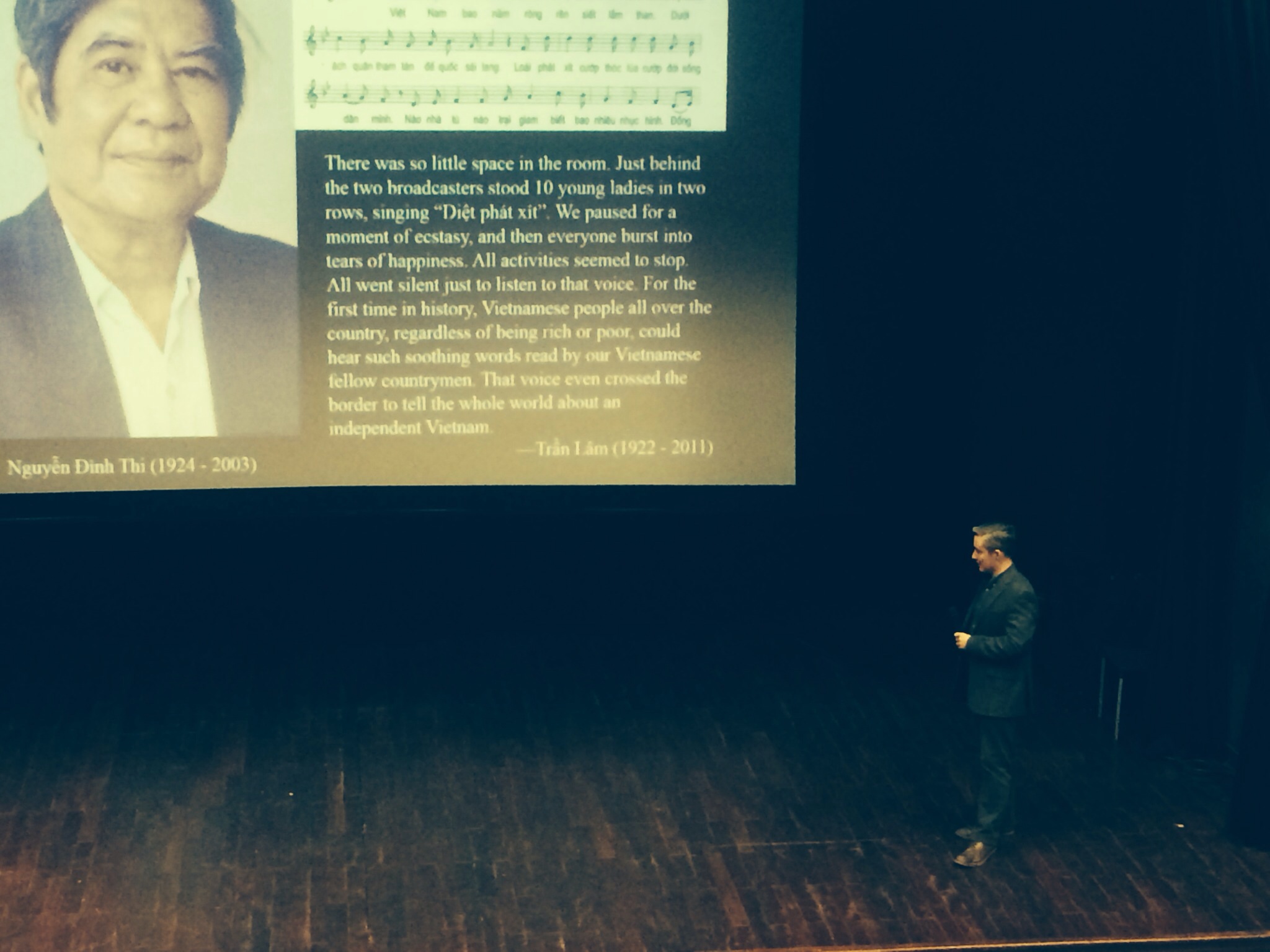 Bài thuyết trình nói về những sự kiện đã diễn ra cả về kỹ thuật và âm nhạc từ ngày đầu phát sóng của Đài Tiếng nói Việt Nam. Bản tuyên ngôn độc lập được phát sóng vào ngày 7 tháng 9 năm 1945, tiếp theo là đoạn nhạc hiệu “Diệt phát xít” đầy hứng khởi của Nguyễn Đình Thi, mà theo tiến sĩ Lonan, tác động xã hội là rất lớn khi chỉ sau một vài tuần nhạc hiệu đó đã trở nên quen thuộc với hầu khắp đại chúng.