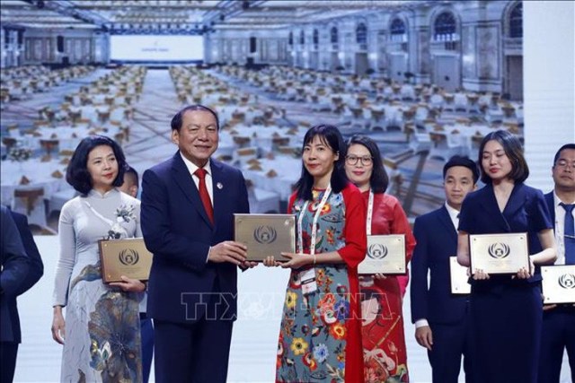 Bộ trưởng Bộ Văn hóa, Thể thao và Du lịch Việt Nam Nguyễn Văn Hùng trao giải cho đại diện một đơn vị của Việt Nam được nhận Giải thưởng Du lịch ASEAN 2024. Ảnh: TTXVN