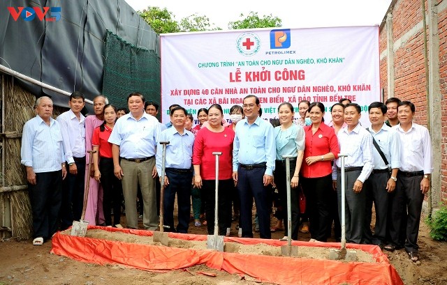 Hội Chữ thập đỏ tỉnh Bến Tre ngày 30/5 phối hợp với Công ty TNHH một thành viên xăng dầu Bến Tre và UBND các huyện ven biển tổ chức lễ khởi công xây dựng 40 căn nhà “An toàn cho ngư dân nghèo, khó khăn” tại các xã bãi ngang, ven biển, xã đảo trên địa bàn tỉnh Bến Tre, gồm: huyện Ba Tri (17 căn), Thạnh Phú (10 căn), Bình Đại (8 căn), Giồng Trôm (5 căn). Mỗi căn nhà có diện tích sử dụng khoảng 50m2, trị giá mỗi căn 50 triệu đồng do Công ty TNHH một thành viên xăng dầu Bến Tre tài trợ.