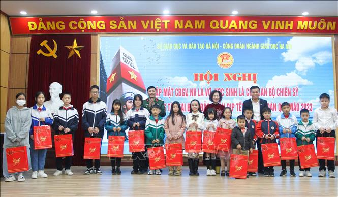 Children of soldiers working in the sea and islands are given Tet gifts during the get-together organized by he Trade Union of Hanoi’s education and training sector. (Photo: VNA)
