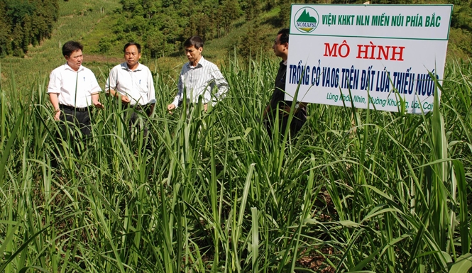 Beside tea research and experiments on sustainable tea cultivation, the Integrated Production Model of combining livestock and crops is a climate change response model NOMAFSI is working on. Mr. Quyen again: “We are planting high-yield VA06 grass which is suitable for animal husbandry. VA06 generates 100 – 300 tons of grass per hectare every year. On 1 hectare, we can raise 20 – 25 cows. Each cow generates 20 million VND, so 20 cows can bring much higher income than growing cassava, rice or maize. In this model, on the upper land we plant orchards, which not only creates shading but also retains water in the soil. There is a path the cows follow to go to the orchard. There, the cows wander round and their dung enriches the soil”.
