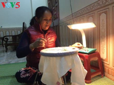 | Artisan Nguyen Thi Hong by her embroidery frame (Photo: To Tuan/VOV5) |