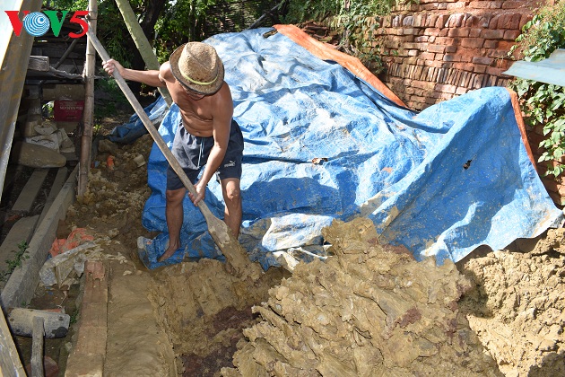 “It takes all day to soften a barrow of clay. The next day it is divided into small pieces and thrashed again and again until it’s smooth. This phase takes 2 or 3 days. It’s necessary to soak the clay. It is then put into a bucket to make it loose using a special machine and then it’s filtered through a net to remove the gravel,” Tuyen said.