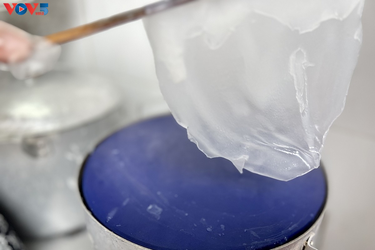 The steamed rice roll pancakes are spread into thin layers of ultra-thin, translucent sheets. (Photo: Huyen Trang/VOV5) |