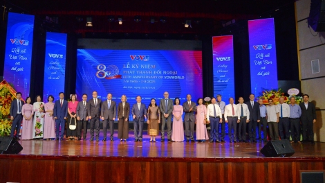 (VOVWORLD) - 9月25日下午,越南之声对外部(VOV5)在河内市馆史街58号国家广播中心隆重举行对外广播八十周年(1945年9月7日 - 2025年9月7日)纪念活动。越共中央委员、越南之声台长杜进士,越南之声领导班子成员,各部门领导,各国驻越大使、外交使团代表及国际组织驻越代表出席活动。