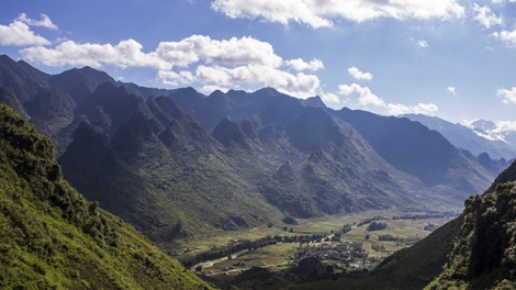 (VOVWORLD) -管簿(Quản Bạ)是河江省北部山区边境县份,是世界地质公园同文岩石高原的门户。管簿境内层峦叠嶂,被深谷、山谷、溪流所分隔。山间蜿蜒的道路给这里增添了魅力,被誉为云中的岩石美景。特别是,在前往管簿的路上,许多游客不由得停下脚步观赏双山美景并赞不绝口,其造化之美与当地民族同胞富于诗意的《双山》传说息息相关。
