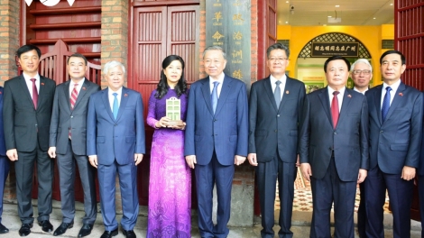 (VOVWORLD) - 据本台驻北京记者报道正对中国进行国事访问的越共中央总书记、国家主席苏林及夫人同越南高级代表团8月18日下午探望越南驻中国大使馆。