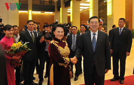 越南国会主席阮氏金银和中国全国人大常委会委员长张德江11月9日下午在河内出席第三届越中青年大联欢活动
