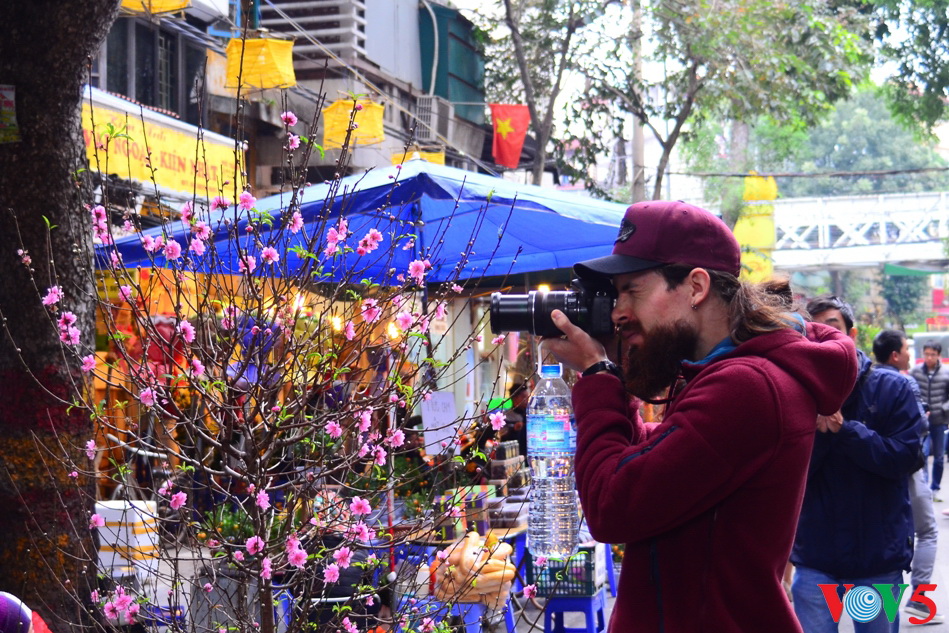 一位外国游客也对越南桃花感兴趣