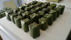 将蒸好的肉与米粉一起搅拌,用手压紧成方形,然后用香蕉叶包起来。三天后,炒米粉裹蒸肉自己就熟了。把香蕉叶打开,方形的炒米粉裹蒸肉呈鲜红色,香味迷人。