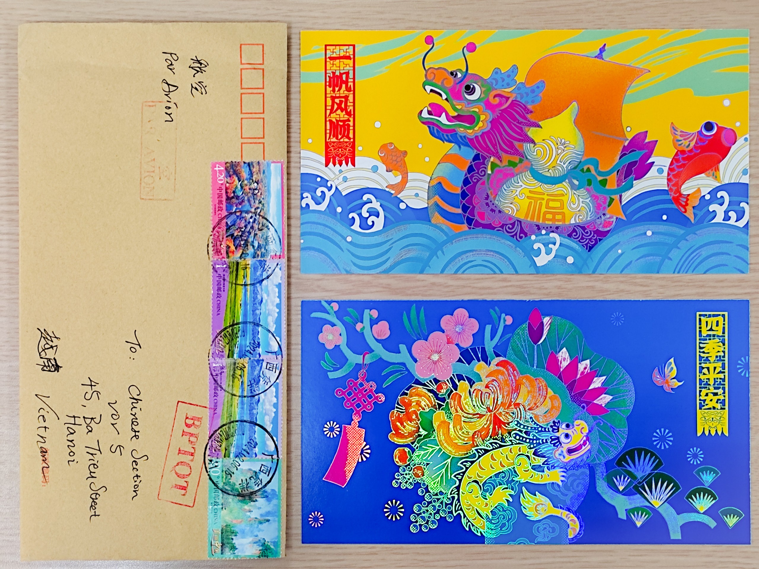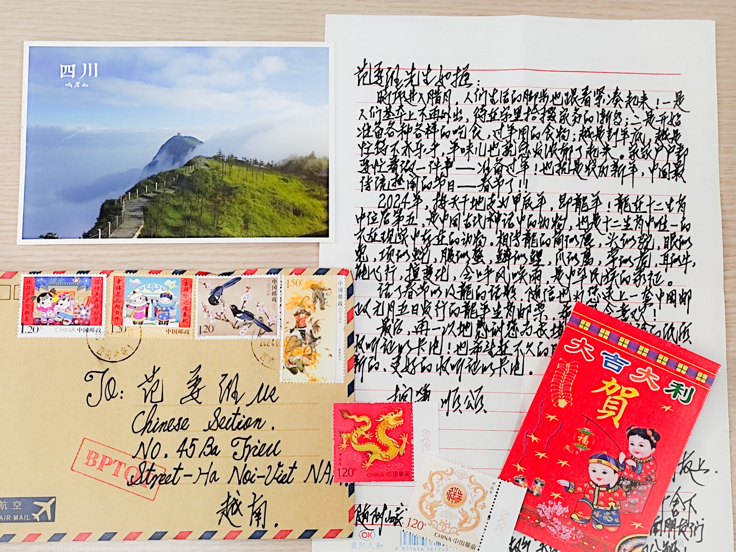 我们在不到一个月内第二次收到了四川省听众梅林寄来的信件。里面有一纸手写信、一张峨眉山风景明信片和两枚中国邮政发行的龙年生肖邮票。信中,梅林写道:“2024年,按天干地支为甲辰年,即龙年。龙在十二生肖中位居第五,是古代神话中的动物,是十二生肖中唯一的不在现实中存在的动物。龙也是我们中华民族的象征物。希望你们喜欢这些邮票和明信片。再一次感谢你们填发的收听证明卡!”