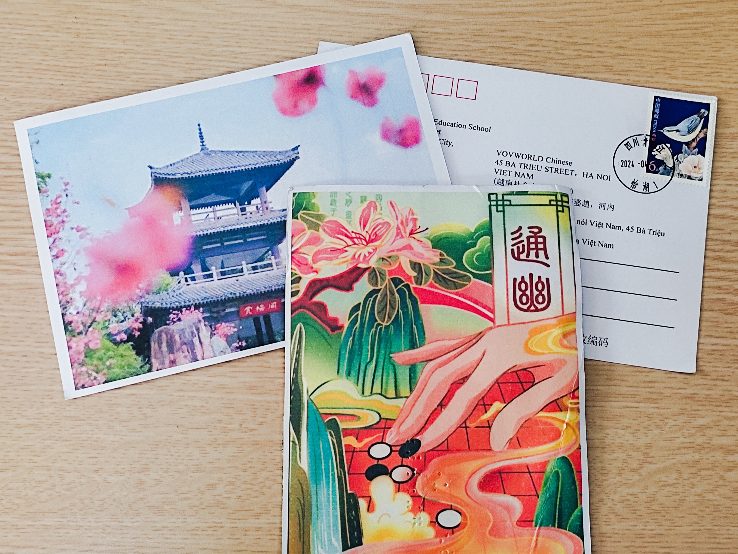 最后,我们希望和大家介绍的是四川省听众张瀚文的3张明信片。这三张明信片邮寄之前,张瀚文发来电子邮件向我们介绍过。其中两张是以四川省成都市樱花盛开的公园为主题,另一张是以围棋为主题,上面印有被称为“长生”的围棋棋形。张瀚文希望以这一棋形的寓意祝愿中越友谊千秋万代、胡志明思想领导下的社会主义越南千秋万代、越南之声广播电台全体编播人员健康顺遂。